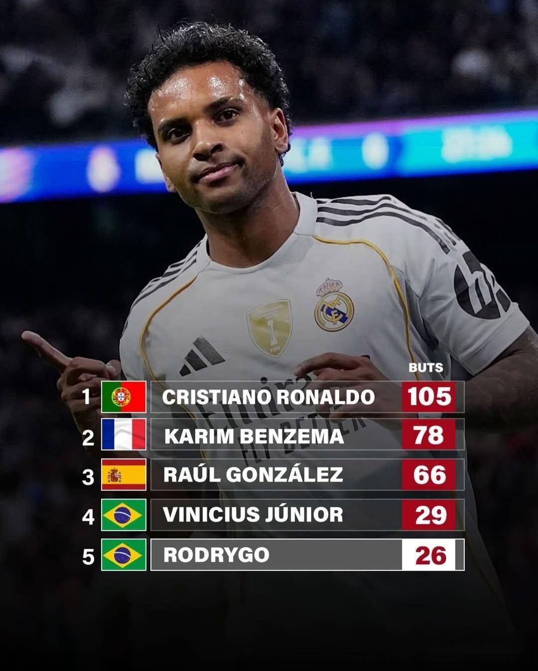 榜单前列的名字,是刻在皇马欧冠基因里的符号:C罗105球的纪录如丰碑般遥不可及,本泽马78球是近十年伯纳乌的进攻旗帜,指环王劳尔66球承载着初代银河战舰的荣光,连同队的小熊维尼修斯,也以29球暂居第四。而罗德里戈的26球,是他在60余场欧冠征程里,用灵动跑位与冷静终结攒下的勋章。